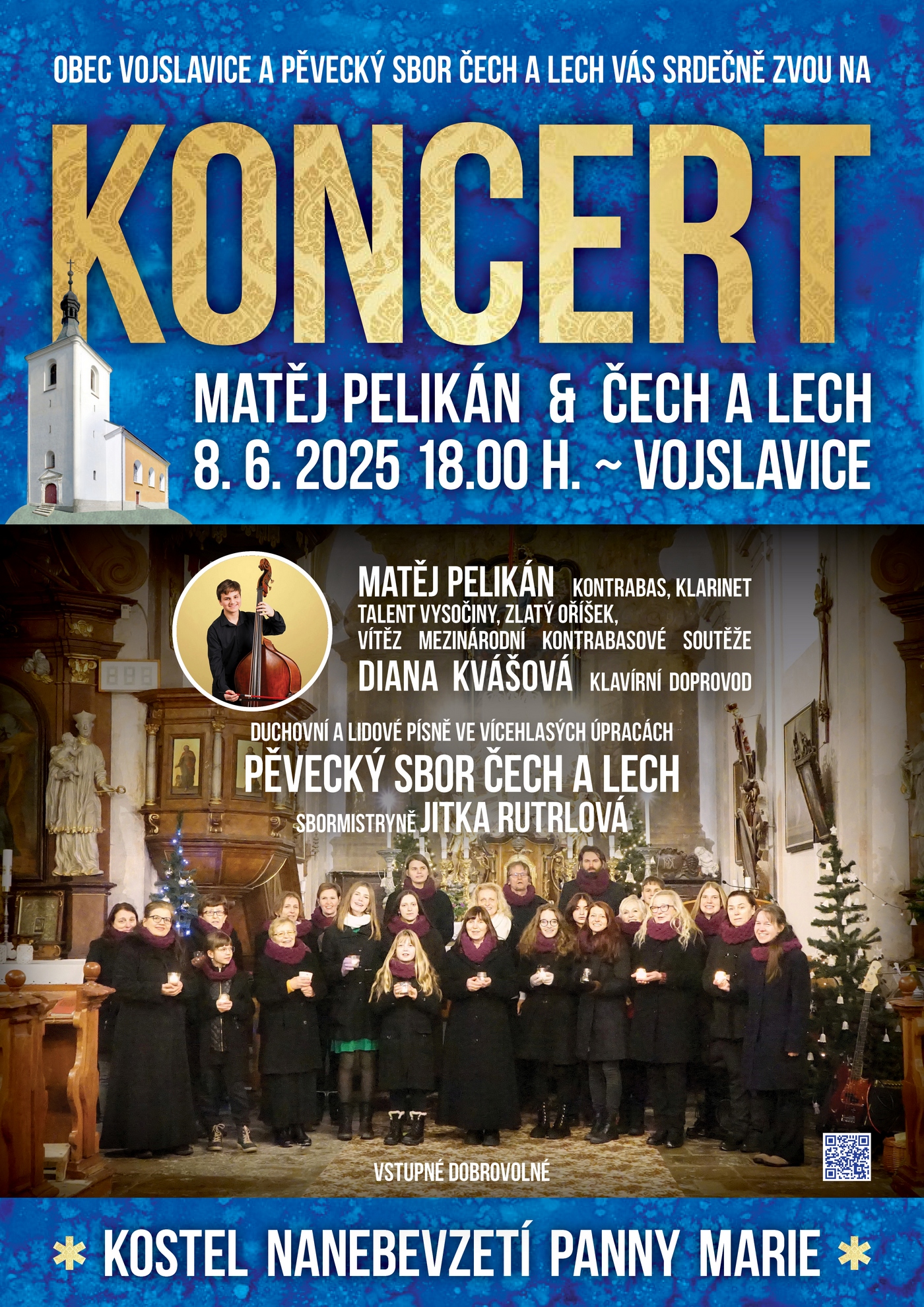 Srdečně zveme do kostela Nanebevzetí Panny Marie ve Vojslavicích v neděli 8. 6. 2025 od 18.00 hodin na společný koncert Matěje Pelikána, Diany Kvášové a pěveckého sboru Čech a Lech.